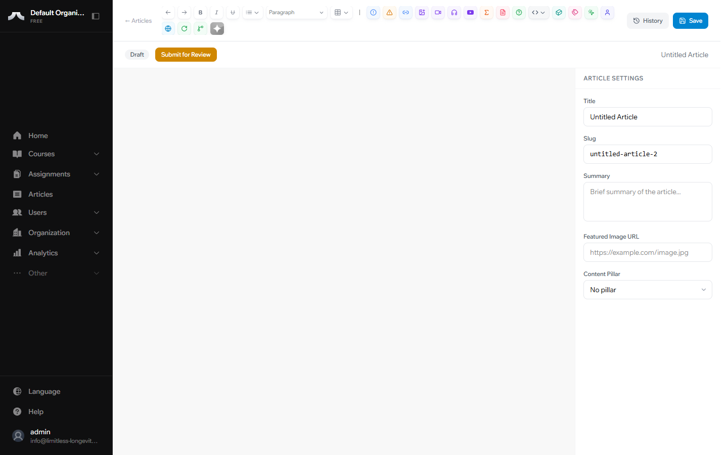 Create a test article. Give it any title, write a sentence or two, and hit Save. You can always delete it later — this is the fastest way to get comfortable with the platform.